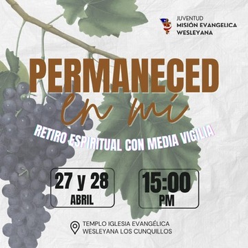 En la Iglesia de Los Cunquillos se realizará esta actividad de la Juventud a Nivel Nacional, comenzando el dia sabado 27 de Abril a las 15:00 hrs. y continuando el dia domingo 28 de Abril; se estará informando por este medio de las actividades en vivo, (dependiendo de la señal)